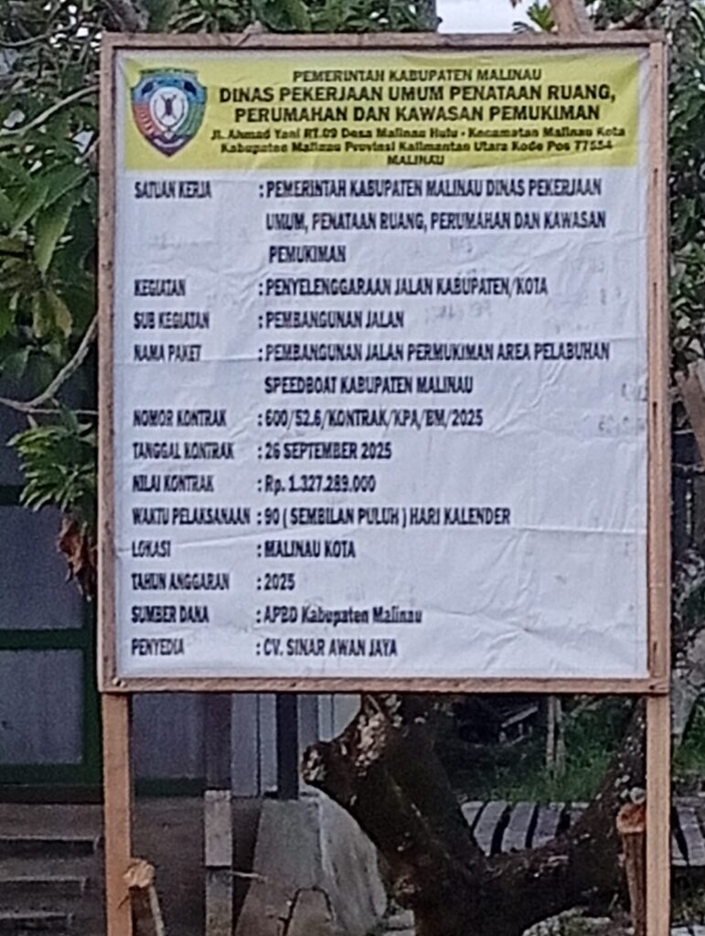 Proyek ini tercatat memiliki nomor kontrak 600/52.6/KONTRAK/KPA/EM/2025 dengan nilai anggaran fantastis, mencapai Rp1.327.289.000. Dana tersebut bersumber dari APBD Kabupaten Malinau Tahun 2025 dengan masa pengerjaan 90 hari kalender, terhitung sejak 26 September 2025.