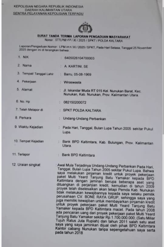 NUNUKAN, LIRANEWS.co | Direktur PT Bone Raya Indah, Hj. Andi Kartini, secara resmi melaporkan Bank Pembangunan Daerah (BPD) Kaltimtara Cabang Nunukan kepada Direktorat Reserse Kriminal Khusus Polda Kalimantan Utara. Laporan dengan nomor STTLPM/153/XI/2025/SPKT/Polda Kaltara tersebut dilayangkan pada Selasa (25/11/25) dengan tuduhan pelanggaran terhadap Undang-Undang Perbankan.