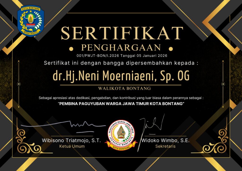 Momen audiensi juga dimanfaatkan untuk memberikan apresiasi kepada salah seorang pembina paguyuban. Wibisono Triatmojo secara khusus menyerahkan piagam penghargaan kepada dr. Hj. Neni Moerniaeni, Sp.OG., yang akrab disapa Bunda Neni, atas dedikasi dan kontribusinya sebagai Pembina Paguyuban Warga Jawa Timur Kota Bontang.